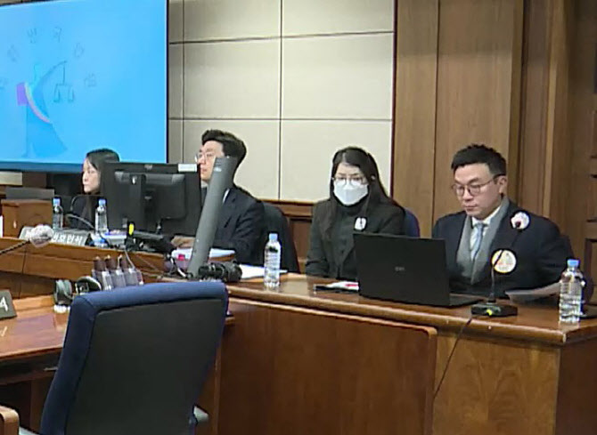 '긴머리·안경' 고개 숙인 김건희…法 재판 일부 중계