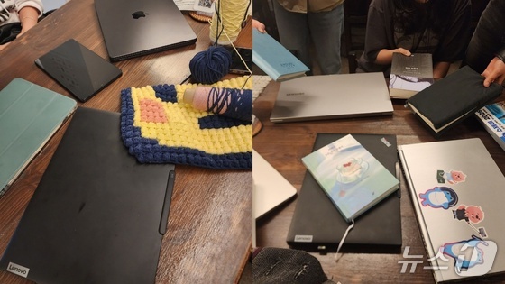 지난 21일과 22일 서울 관악구 봉천동에서 열린 '어드민 나이트' 모임 중 참가자들이 오늘의 일거리를 수행할 노트북·테블릿·책·뜨개감을 모아 인증 사진을 찍고 있다./…