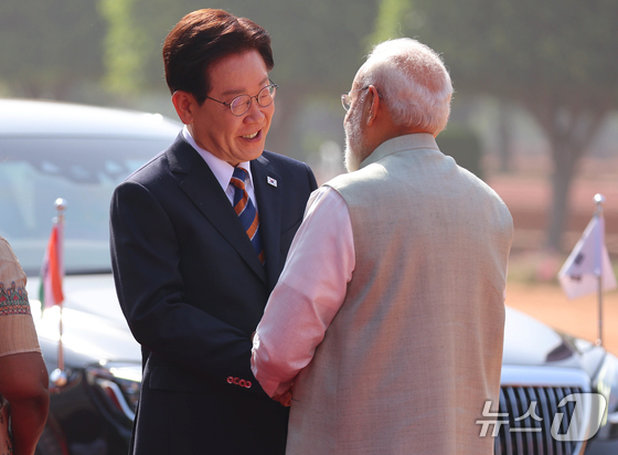 이재명 대통령이 20일 뉴델리 대통령궁 광장에서 열린 공식환영식에서 나렌드라 모디 인도 총리와 인사하고 있다. 2026.4.20 뉴스1 이재명 기자인…