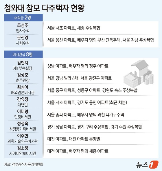 뉴스1 윤주희 디자이너청와대 참모진 중 다주택자가 10명인 것으로 집계됐다. 5명 중 1명 꼴이다. 26일 정부공직자윤리위원회가 관보를 통해 공개한 …