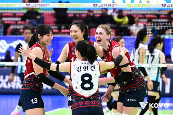현대건설 선수들. KOVO 제공여자 프로배구 현대건설이 GS칼텍스를 완파하고 2위로 도약했다.현대건설은 2일 경기 수원체육관에서 열린 진에어 2…