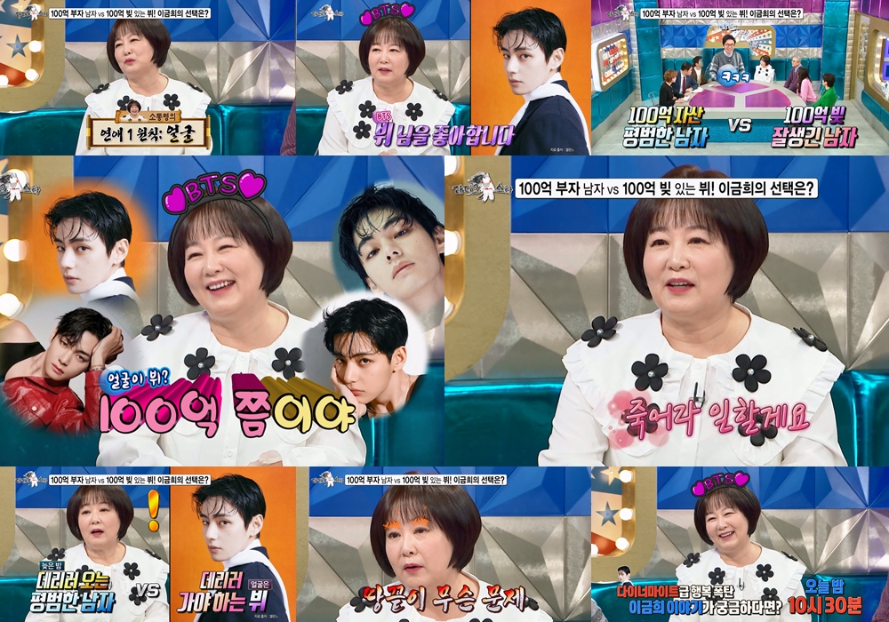 ‘라디오스타’에 출연한 이금희가 자신만의 연애 원칙을 공개한다. 자신의 이상형을 BTS 뷔라고 밝힌 이금희는 고난도 밸런스 게임에서도 과몰입하며 뷔를 향한 팬심을 드러낸다. 오늘(