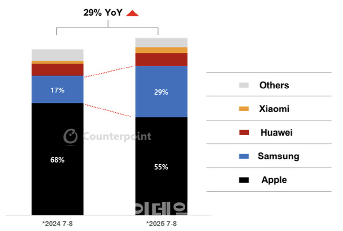 [이데일리 유준하 기자] 올해 7~8월 100만원대 스마트폰 판매량이 늘어난 가운데 삼성과 샤오미, 오포의 점유율이 동반 상승한 것으로 나타났다. 전체 스마트폰 판매량은 전년 동기