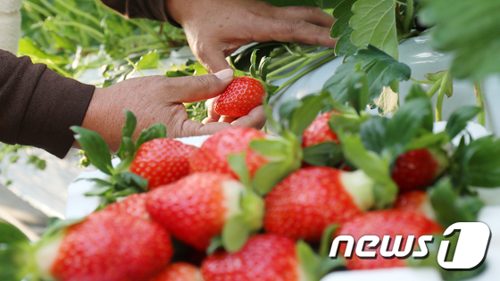 절기상 소설小雪인 일 전북 완주군 삼례읍 한 딸기 농장에서 농장주가 딸기를 수확하고 있다. ../뉴스 News 유경석…