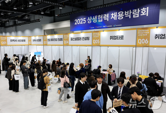 지난해 10월 21일 서울 강서구 코엑스 마곡에서 열린 '2025 상생협력 채용박람회'를 찾은 구직자들이 행사부스를 살펴보고 있다. 2025.10.21 뉴스…