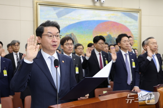 이억원 금융위원장이 일 서울 여의도 국회에서 열린 정무위원회 금융위원회 등에 대한 국정감사에 출석해 증인선서하고 있다. ../뉴스 New…