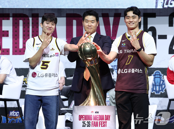 창원LG 양준석, 조상현 감독, 유기상이 29일 서울 용산구 블루스퀘어에서 열린 2025-26 LG전자 프로농구 개막 미디어데이팬페스트에서 기념촬영을 하고 있다…