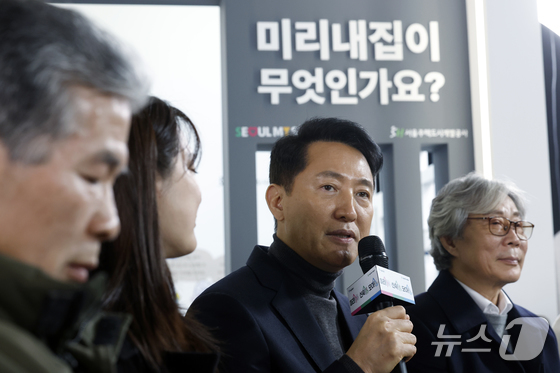 오세훈 서울시장이 4일 오후 서울시 중구 세종대로 서울도시건축전시관에서 열린 주택정책소통관 집들이 및 소통의 날 행사에서 신속통합기획 참여단, 신혼부부 등 120명의 참…