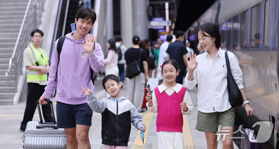 추석 연휴가 시작된 일 오전 서울역에서 귀성객 정우진 씨 가족이 고향인 대구로 향하며 인사하고 있다. ../뉴스 News 박지혜 기자…