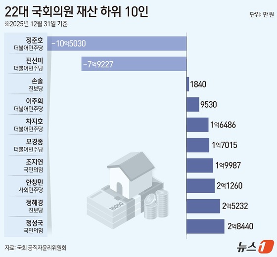 뉴스1 김지영 디자이너22대 국회의원 재산 순위에서 정준호 더불어민주당 의원이 최하위를 기록했다.국회 공직자윤리위원회가 26일 공개한 '2026년도 …