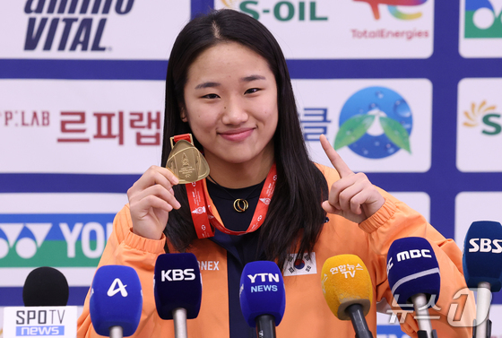 배드민턴 왕중왕전에서 시즌 최다 11관왕 대기록을 달성한 ‘셔틀콕 여제’ 안세영이 22일 오후 인천국제공항을 통해 귀국해 메달을 들고 포즈를 취하고 있다. 안세영은 중국…