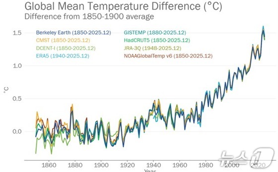 8개 국제 데이터세트로 확인한 1850~1900년 평균 대비 전 지구 연평균기온 편차기상청 제공 뉴스1지난해 전 세계 평균기온이 관…