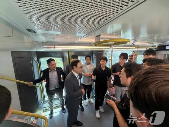 이용배 현대로템 사장이 지난달 27일현지 시간 호주 시드니 NIF신규 도시간 열차 2층 전동차를 탑승한 뒤 기자들과 만나 인사하는 모…
