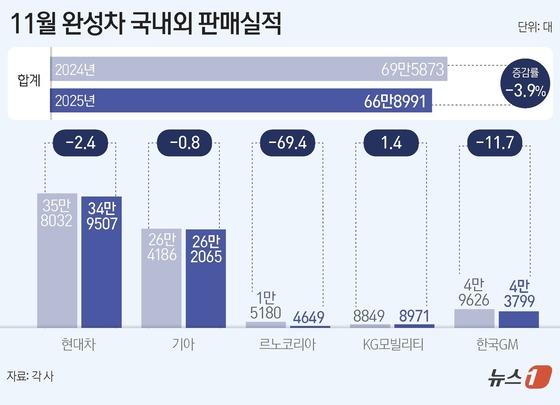 韓 완성차 11월 판매 내수·수출 모두 주춤…두 달 연속 하락(종합)