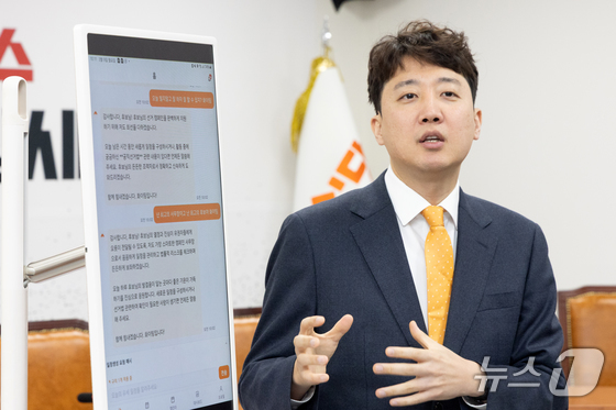 이준석 개혁신당 대표가 지난 9일 서울 여의도 국회에서 열린 'AI 선거 사무장' 앱 시연회에서 앱을 소개하고 있다. 2026.3.9 뉴스1 이승배 기자…