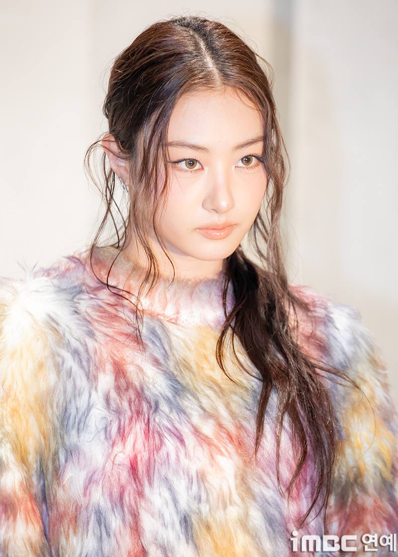 미야오(MEOVV) 가원이 17일 오후 서울 이태원에 위치한 한 팝업스토어 매장에서 열린 패션 브랜드 한남점 오픈 행사에 참석해 포즈를 취하고 있다. 이날 가원은 굵은 웨이브 묶음