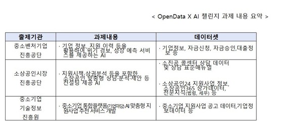 중기부가 오픈데이터 AI 챌린지를 연다 중기부 제공공공기관이 실제 사용하는 현장 데이터를 AI 스타트업에 개방해 중소기업·소상공인을 위한 혁신 …