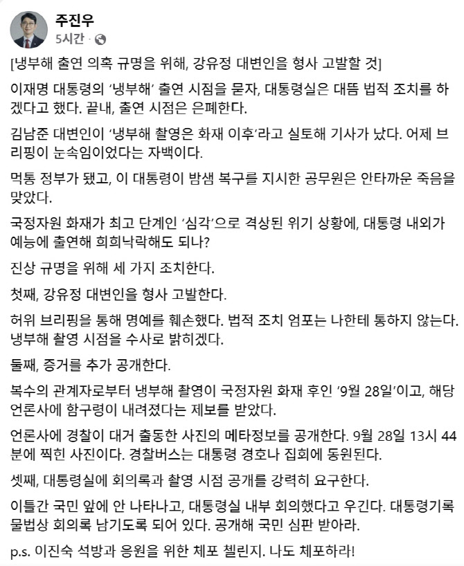 [이데일리 양지윤 기자] 주진우 국민의힘 의원은 이재명 대통령 부부의 JTBC 예능 프로그램 촬영 시점이 대전 국가정보자원관리원 화재 이후였다고 거듭 주장하며, 허위사실을 브리핑한
