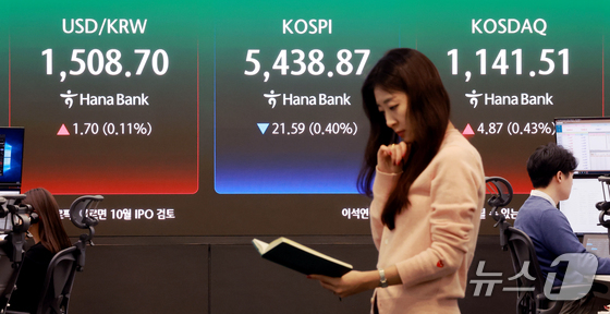 27일 서울 중구 하나은행 본점 딜링룸 전광판에 종가가 표시되고 있다. 이날 코스피지수는 전일 대비 21.59포인트p0.40% 내린 …