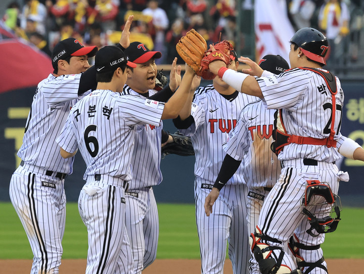26일 서울 잠실구장에서 열린 한화 이글스와 한국시리즈 1차전에서 승리를 거둔 뒤 기뻐하는 LG 트윈스 선수들 (MHN 금윤호 기자) 프로야구 LG 트윈스가 한국시리즈라는 큰 무대