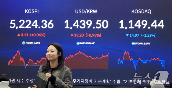 30일 서울 중구 우리은행 본점 딜링룸 전광판에 코스피 종가가 표시되고 있다. 이날 코스피는 전 거래일 대비 3.11p0.06% 상승한 5224.36에…