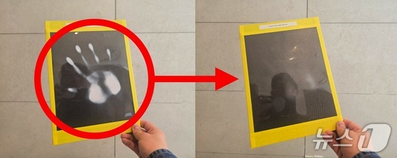 재료연구원과 한국남부발전이 공동 개발 중인 BIPV건물일체형 태양광 시연제품 모습. 손바닥을 필름에 가져다 대자 색이 밝게 변했다. 건물 외벽이나 창호…