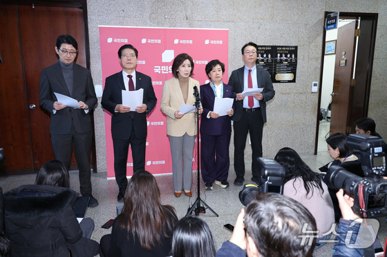 나경원 의원을 비롯한 국민의힘 법제사법위원회 소속 의원들이 5일 서울 여의도 국회에서 민주당의 일방적 법사위 회의 취소 통보를 규탄하고 있다. 2026.1.5/뉴스1 &…