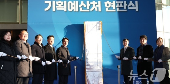 김민석 국무총리가 2일 오전 세종시 정부세종청사 6동에서 열린 기획예산처 개청 현판식에 참석해 부처 관계자들과 현판 제막을 하고 있다. 2026.1.2/뉴스1 ©…