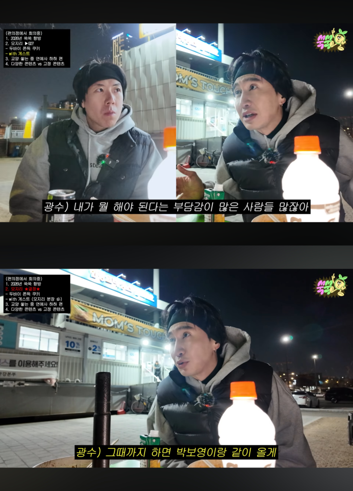 (MHN 김설 기자) 배우 이광수가 엉뚱하고 파격적인 예능 기획안으로 절친 양세찬을 당황케 했다. 지난 24일 유튜브 채널 ‘쑥쑥’에 공개된 영상에서는 주인장 양세찬과 이광수가 한