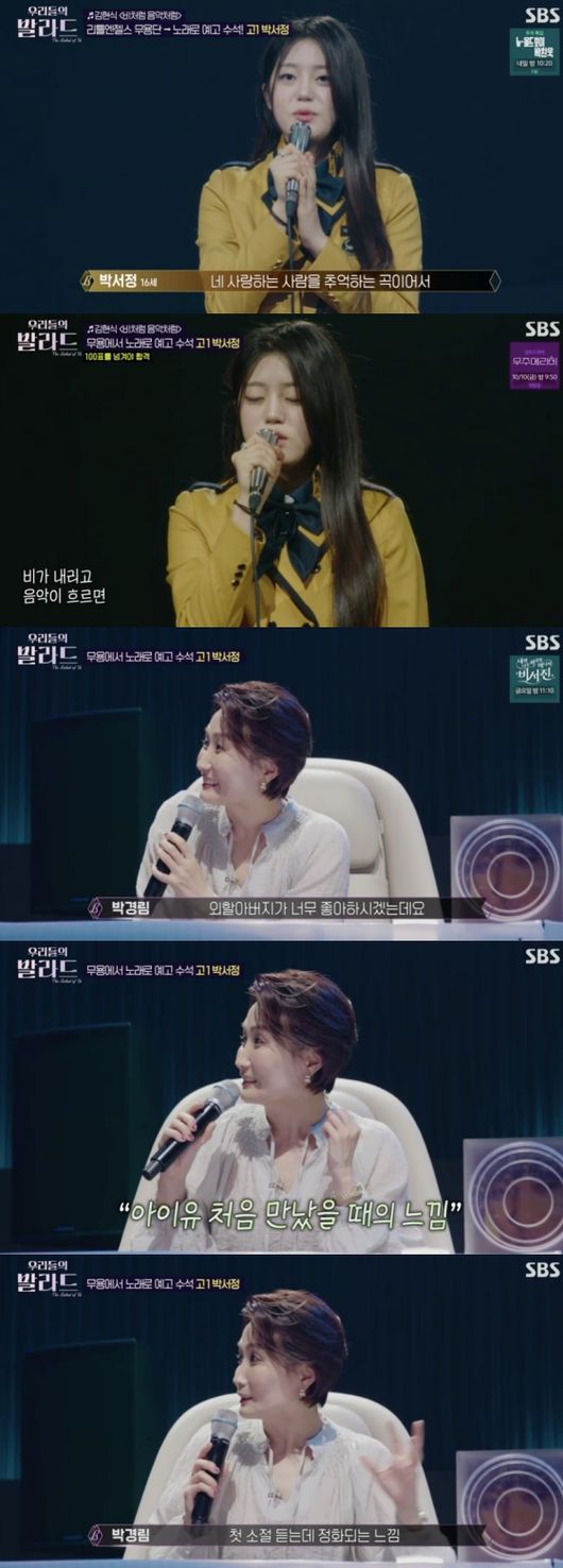 방송 시청 후 작성된 리뷰 기사입니다. [OSEN=임혜영 기자] 박경림이 한 참가자를 아이유와 비교했다. 7일 방송된 SBS ‘우리들의 발라드’ 3회에서는 본선 1라운드에 참여하는
