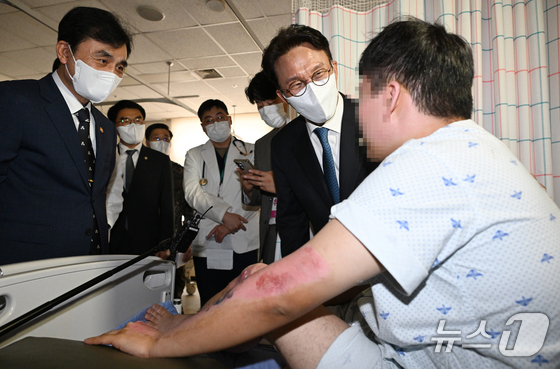 김민석 국무총리와 안규백 국방부 장관이 추석 연휴 둘째 날인 일 오후 경기 성남시 국군수도병원을 찾아 입원 장병을 위문하고 있다. 공동취재 .…