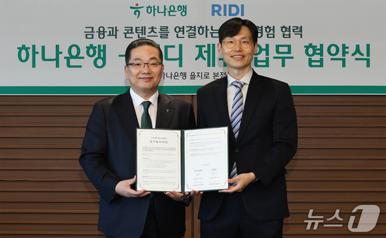 이호성 하나은행장왼쪽과 배기식 리디 대표이사가 협약서를 들고 기념촬영을 하고 있다하나은행 제공.하나은행은 지난 10일 오후 을…