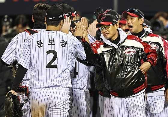 일 서울 송파구 잠실야구장에서 열린 프로야구 신한 SOL뱅크 KBO 포스트시즌 한국시리즈 차전 한화 이글스와 LG 트윈스의 경기, LG 염경엽 감독이 …