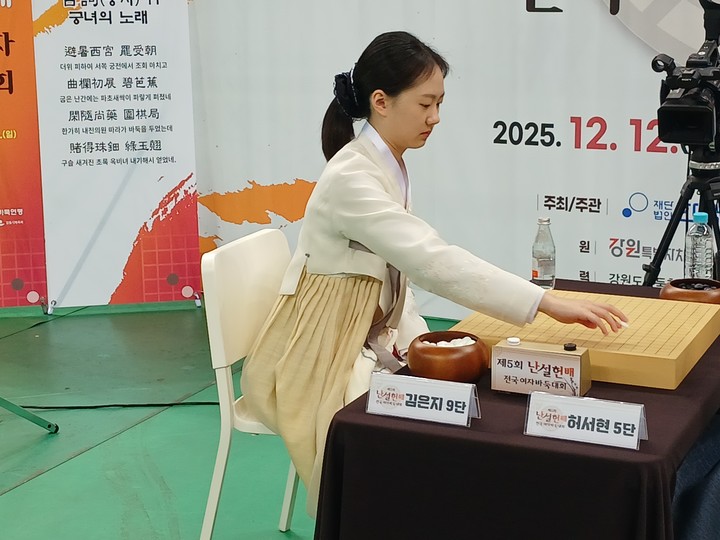 김은지 9단이 첫 수를 두고 있다.(사진 강릉에서 MHN 엄민용 선임기자) (MHN 엄민용 선임기자) 역시 명불허전이었다. 조선 중기의 여류 시인 허난설헌의 고향 강릉에서 열리고