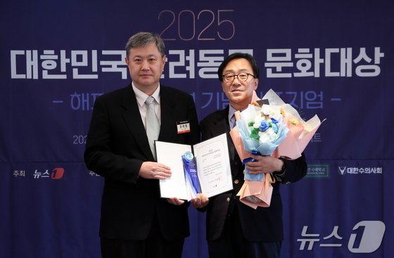 3일 서울 중구 롯데호텔에서 열린 2025대한민국 반려동물 문화대상에서 윤태형 뉴스1 상무가 한국인간동물상호작용연구회에게 뉴스1 대표이사상연구을 전달하…
