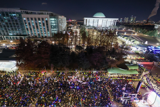 12·3 비상계엄 1년을 맞은 3일 서울 여의도 국회 앞에서 열린 '12·3 내란외환 청산과 종식, 사회대개혁 시민대행진'에 참석한 국회의원들과 시민들이 응원봉을 들고 …