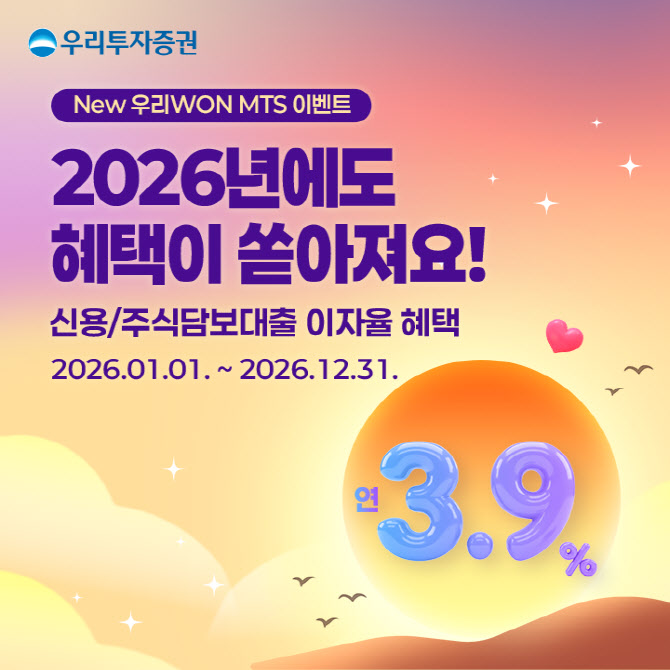 [이데일리 신하연 기자] 우리투자증권은 고객의 투자 자금운용 부담을 낮추기 위해 올해 연말까지 예정됐던 ‘연 3.9% 신용·대출거래 우대금리’ 이벤트를 2026년 12월 31일까지