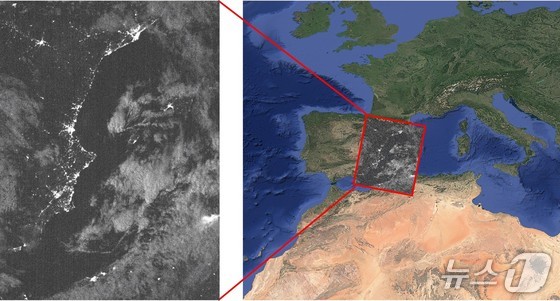 ROKITS 보조 카메라로 촬영한 밤 영상왼쪽과 영상을 스페인 동남부에 투영한 모습.우주항공청 제공·재판매 및 DB 금지 /뉴스1…