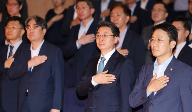 이억원 금융위원회 위원장(앞줄 오른쪽 두번째)이 지난 9월 15일 서울 종로구 정부서울청사 별관에서 열린 취임식에서 국민의례를 하고 있다. 사진=뉴스1 [이데일리 김나경 기자] 석