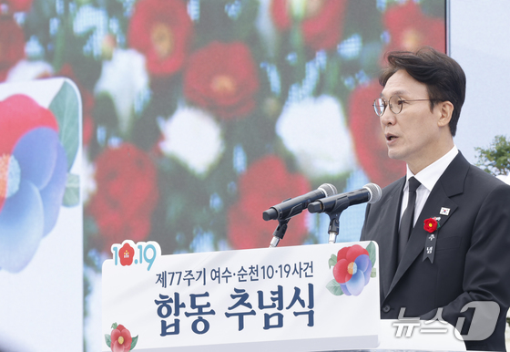 김민석 국무총리가 일 오전 구례군 지리산역사무화관에서 열린 여수·순천·사건 제주기 합동추모식에서 추념사를 하고 있다. ../뉴스 copy…