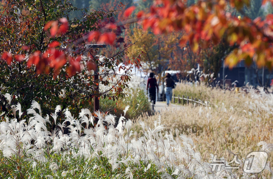 완연한 가을 날씨를 보인 일 경기 화성시 동탄호수공원을 찾은 시민들이 만개한 억새밭 사이에서 산책을 하고 있다. ../뉴스 News 김…