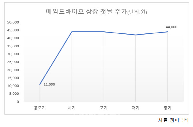‘삼성 픽’ 에임드바이오, 상장 첫날 ‘따따블’ 달성…시총 19위 껑충