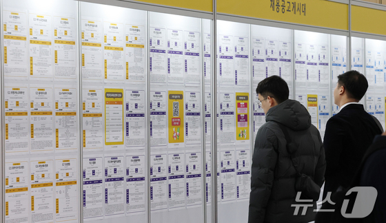 구직자들이 채용정보를 살피고 있다. 2025.11.19/뉴스1 News1 김기태 기자정부가 서비스업을 중심으로 한 견조한 고용 증가세에도 불구하고 청…