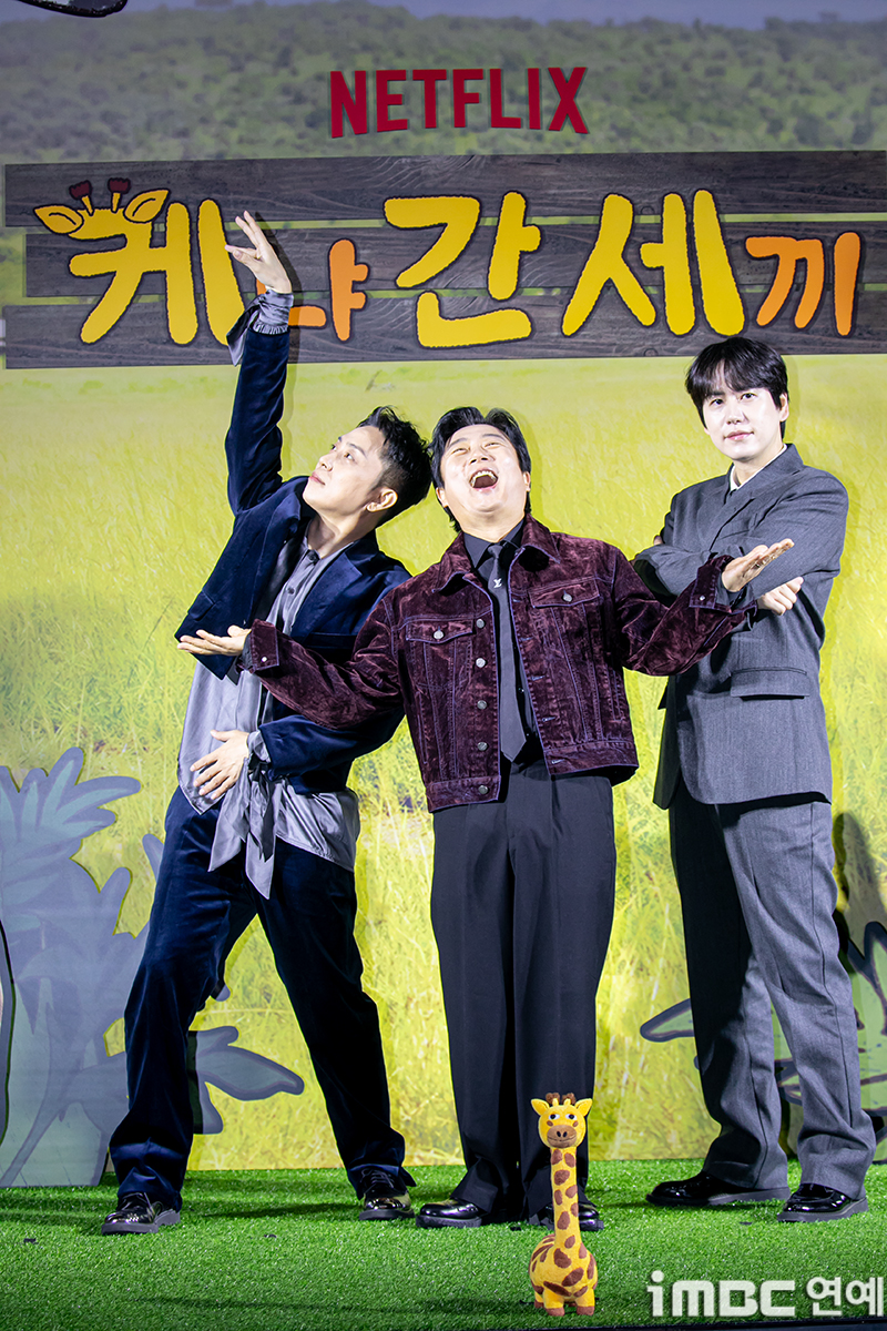 은지원, 이수근, 규현이 25일 오전 서울 용산CGV에서 열린 넷플릭스 오리지널 예능 ‘케냐 간 세끼’ 제작발표회에 참석해 포즈를 취하고 있다. ‘케냐 간 세끼’는 이수근, 은지원