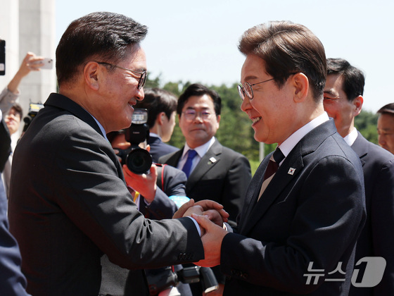 이재명 대통령이 지난해 취임 선서를 하기 위해 서울 여의도 국회에 들어서며 우원식 국회의장과 악수하고 있다. 2025.6.4 뉴스1 국회사진기자단이재…
