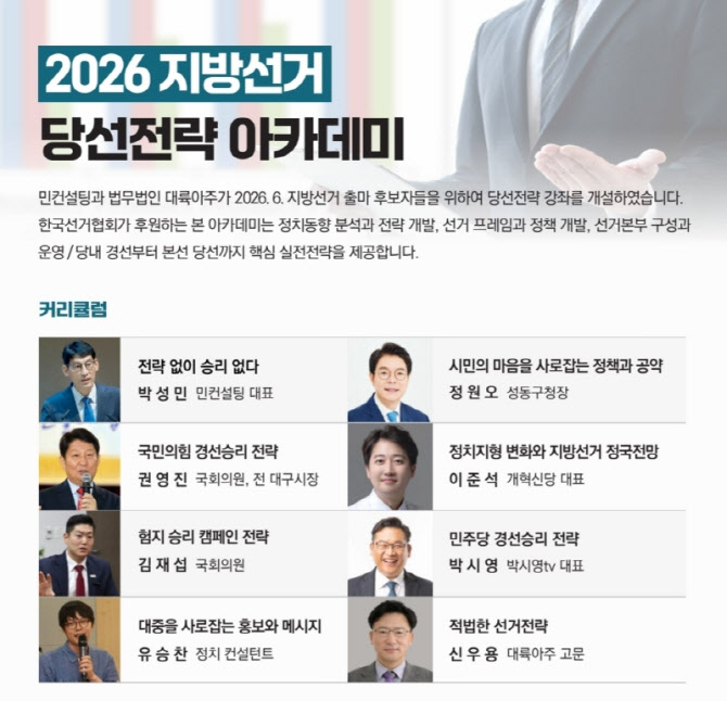 [이데일리 백주아 기자] 법무법인 대륙아주가 정치 컨설팅 그룹 민컨설팅과 함께 2026년 6월 실시되는 지방선거 출마 후보자들을 위해 ‘2026 지방선거 당선전략 아카데미’를 개최