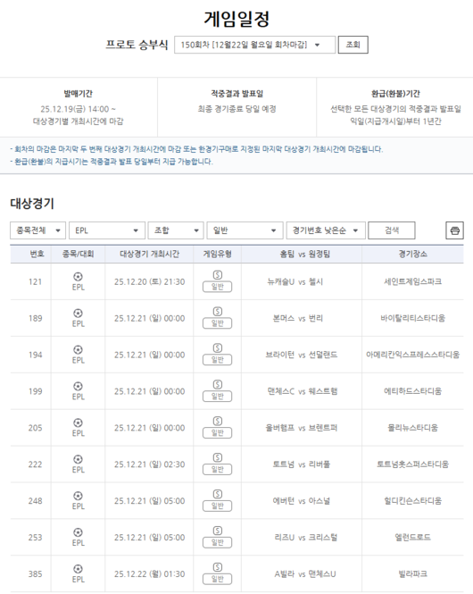 스포츠토토, 2025-2026시즌 EPL 대상 프로토 승부식 150회차 발매 개시 일반, 핸디캡, 언더오버, SUM 등 다양한 유형으로 발매…12월 19일(금) 오후 2시부터 구매