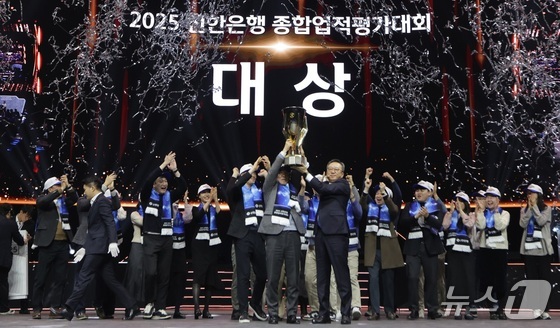 지난 17일 인천광역시 중구 소재 인스파이어 엔터테인먼트 리조트 아레나에서 개최한 ‘2025년 종합업적평가대회’에서 정상혁 신한은행장가운데 오른쪽과 박…