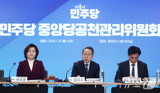 김이수 더불어민주당 공천관리위원장이 지난 23일 오전 서울 영등포구 더불어민주당 당사에서 열린 중앙당공천관리위원회 2차 회의에서 모두발언을 하고 있다. 2026.2.23…