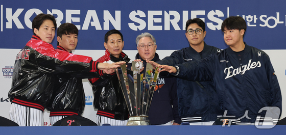 일 서울 잠실야구장에서 열린 신한 SOL뱅크 KBO 한국시리즈 미디어데이에서 LG·한화 감독, 선수들이 트로피에 손을 모이고 있다. LG와 한화의 한국시리즈…